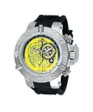 Stainless steel case with a black rubber strap. Unidirectional stainless steel bezel. Yellow perforated skeleton dial with luminous hands and GMT scale. Minute markers around the outer rim. Luminiscent hands and dial markers. Two sub-dials displaying: 60 seconds and day of the week. Power reserve display. Quartz movement. Scratch resistant flame fusion crystal. Screw down crown. Case diameter: 50 mm. Case thickness: 18 mm. Tang clasp. Water resistant at 500 meters (1650 feet). Functions: hours, minutes, seconds, date, chronograph. Invicta Subaqua Noma Sport Alarm GMT Mens Watch 6119..../ Invicta Subaqua Noma Sport Alarm GMT Mens Watch 6119 / Swiss Watches Discount